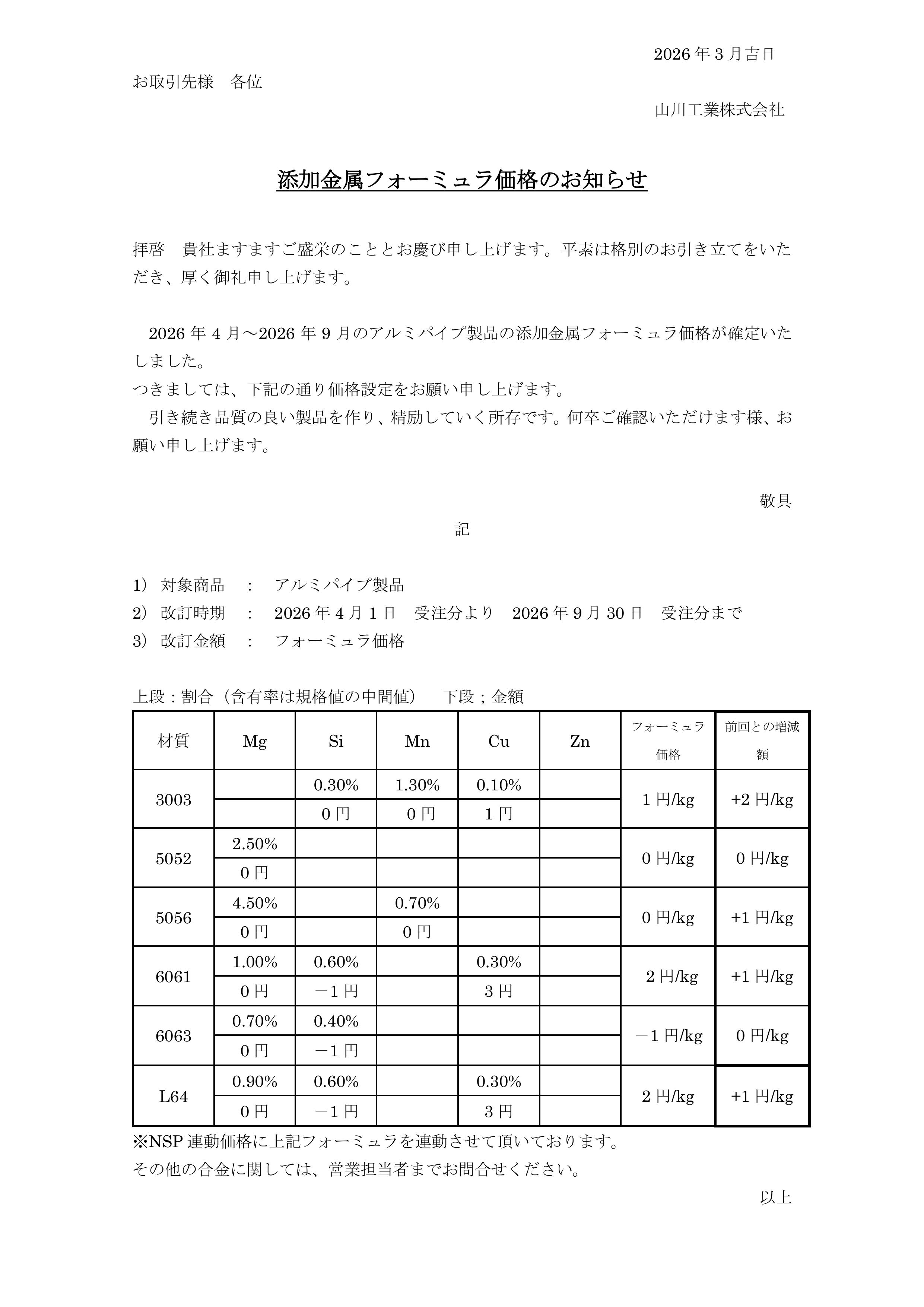2026年4月~2026年9月添加元素フォーミュラ価格の件